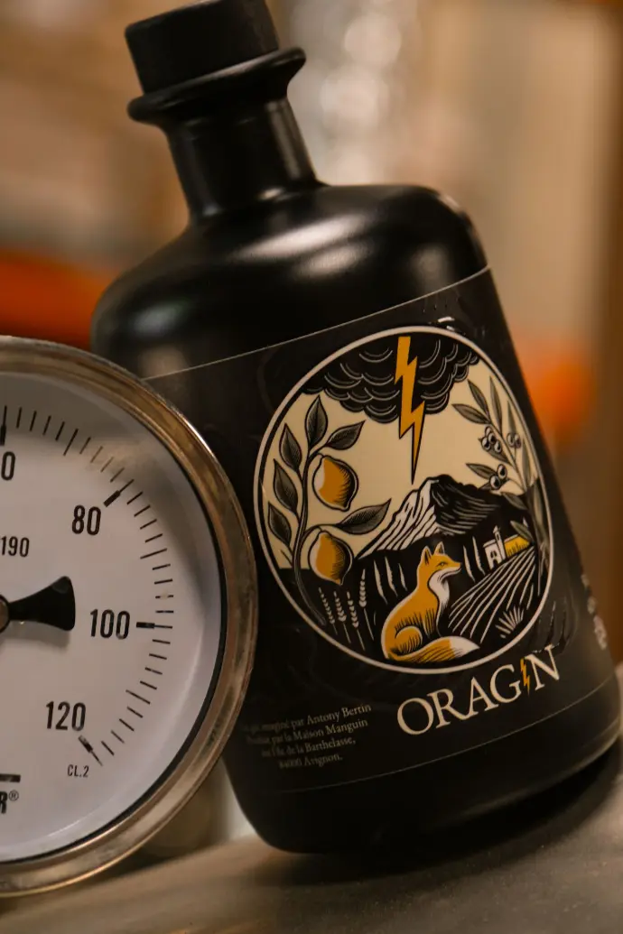 Fruit d’une collaboration entre l’univers créatif d’Antony Bertin et l’expertise artisanale de la Distillerie Manguin, dirigée par Béatrice et Emmanuel Hanquiez, située sur l’île de la Barthelasse à Avignon. Oragin a nécessité 18 mois de recherche, de macérations et de dégustations pour transformer une vision poétique en spiritueux réel. Un travail sur mesure, entre intuition, technique et terroir.